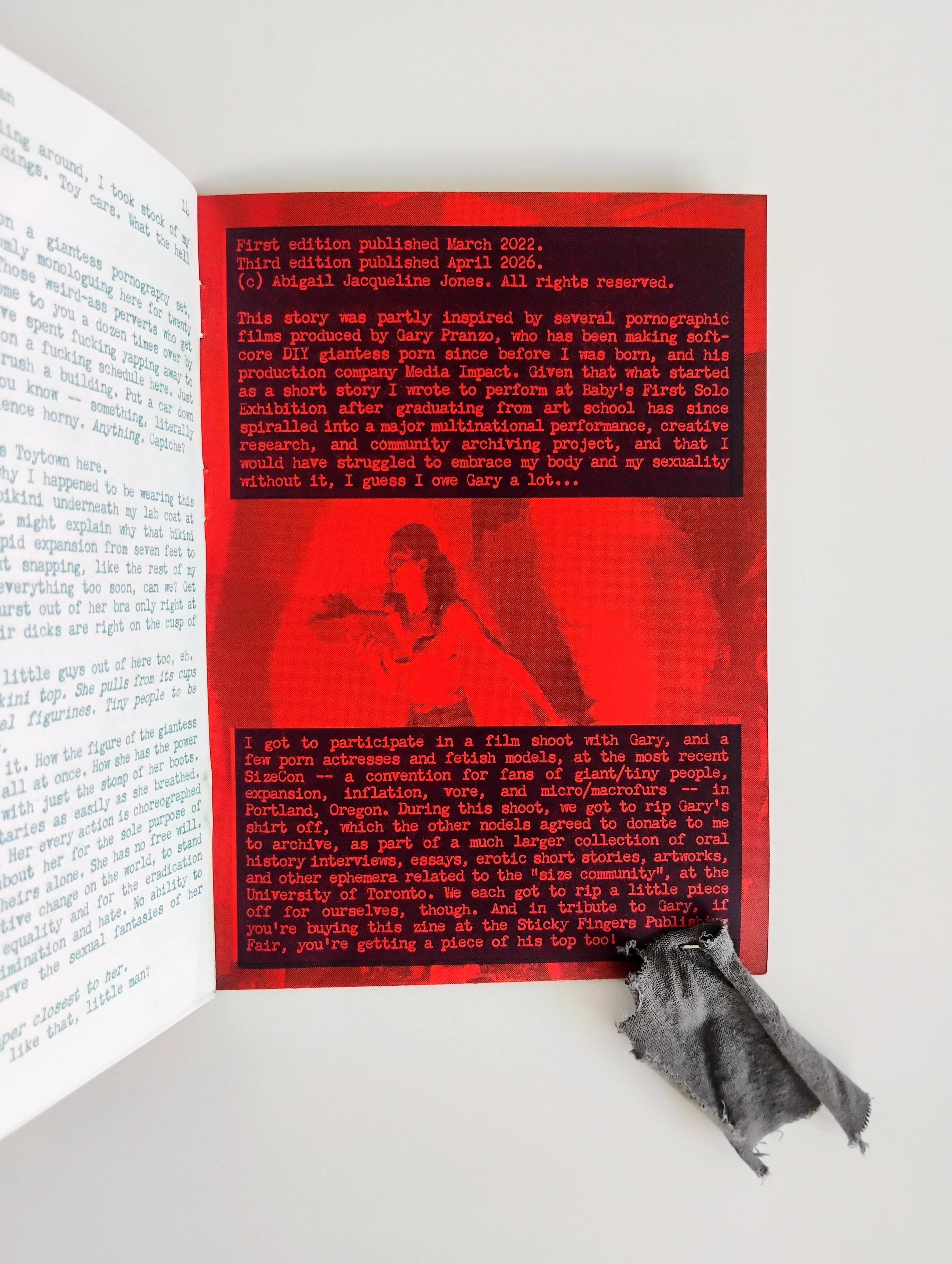 Since 2022, Abigail has produced and distributed zines, pamphlets, and poster prints, produced with the help of her very own risograph duplicator, at markets, fairs, and festivals across the UK, including Glasgow Zine Fest, Tate Britain’s Queer & Now, Grrrl Zine Fair, and Margate Zine Fair. Select zines of Abigail’s have been archived by the Wellcome Collection Library and the University of Lincoln, and will be archived by the Bishopsgate Institute and the University of Toronto as part of larger accessions of materials related to The Giantess Speaks. Following the launch of her bi-monthly subscriber-only mail-out zine series, The 50-ft Mail-Out, in August 2025, in 2026 Abigail will be embarking on a major expansion of her risograph printing and micro-publishing operations, under the name The Fifty-Foot Press.