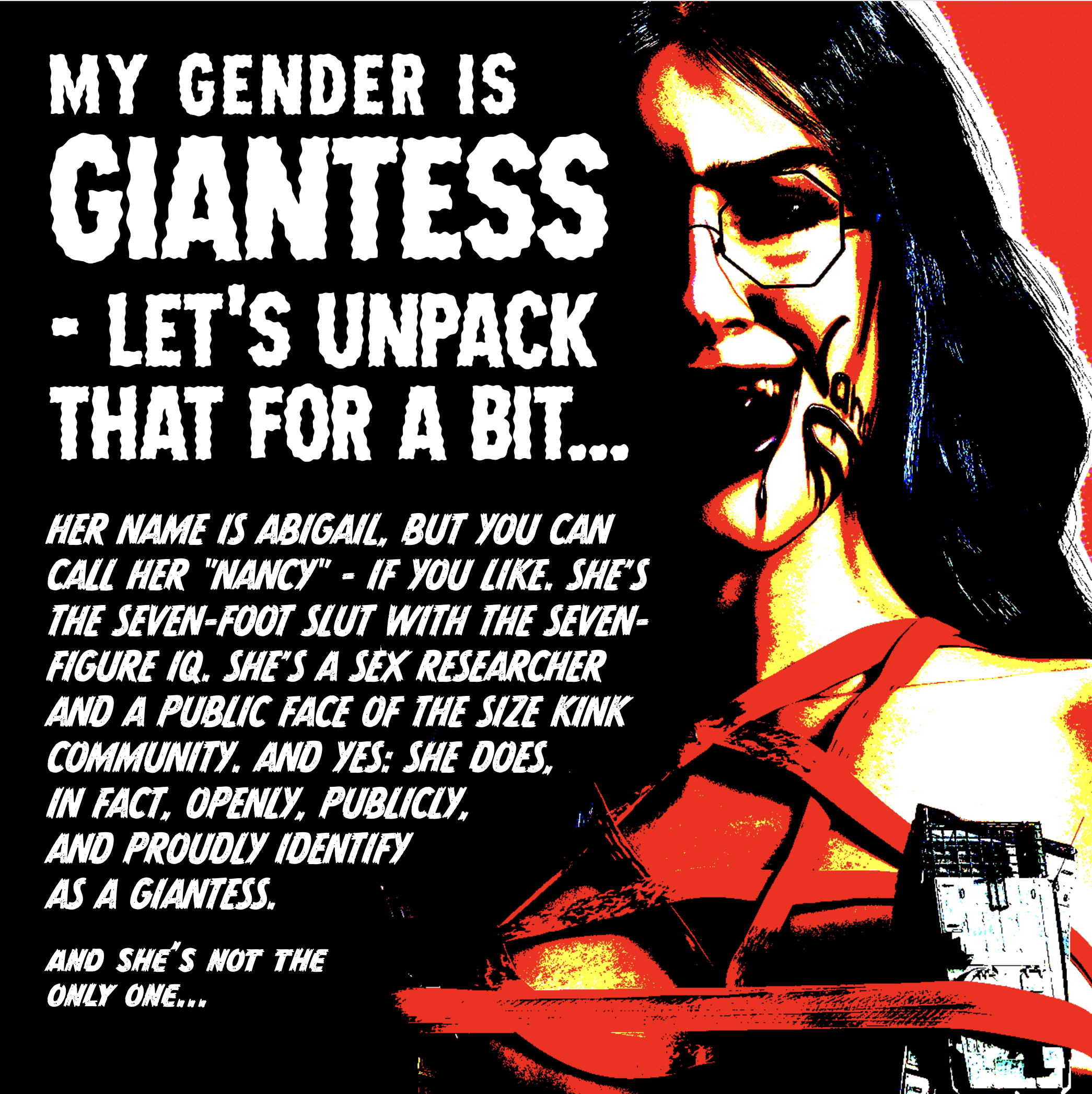 “NANCY. SHE’S THE SEVEN-FOOT SLUT WITH THE SEVEN-FIGURE IQ. THE GENIUS GIANTESS WHO MADE NATURE HER ABSOLUTE BITCH. THE APOCALYPTIC SAPPHIC. THE DOOMSDAY DOMINATRIX. THE DEVIL-DYKE WHOM GOD HIMSELF CALLS MOMMY. THE PATRIARCHY’S WORST NIGHTMARE…”